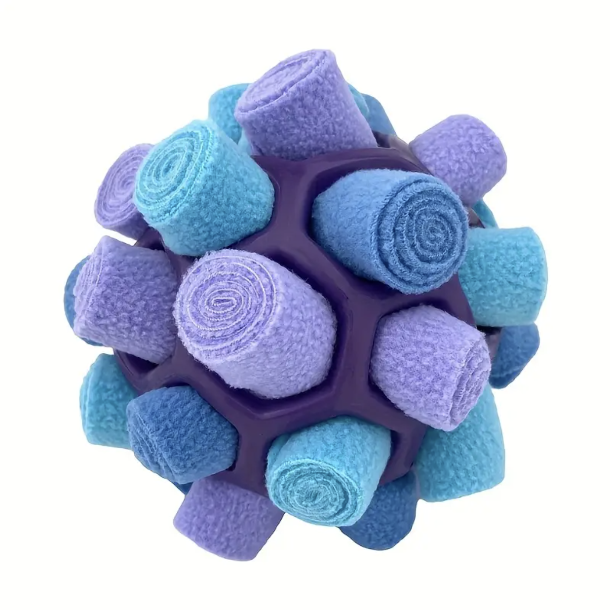 Meet the Snuffle bomb: a unique snuffle ball featuring a durable plastic frame and 35 soft fabric strips that can be rolled up to hide treats or kibble. Simply tuck the goodies inside and let your dog sniff, search, and solve the puzzle to find them!